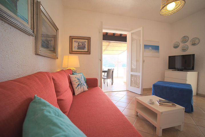 All'esterno, un'ampia terrazza arredata con un tavolo da 8 persone che unisce soggiorno e camera da letto matrimoniale, dalla quale è possibile ammirare la baia e i stupendi tramonti dell'Isola.
